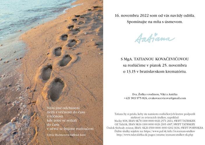 Rozlúčka so zosnulou Tatianou Kovačevičovou sa uskutoční v piatok 25. novembra o 13.15 hod. v bratislavskom krematóriu.